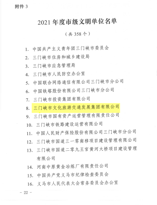 近日,三門峽市委、市政府印發(fā)《關(guān)于命名2021年度三門峽市文明村鎮(zhèn)、文明單位和文明校園稱號(hào)的決定》(三文〔2022〕71號(hào)),市文旅集團(tuán)榮獲“2021年度市級(jí)文明單位”稱號(hào)。